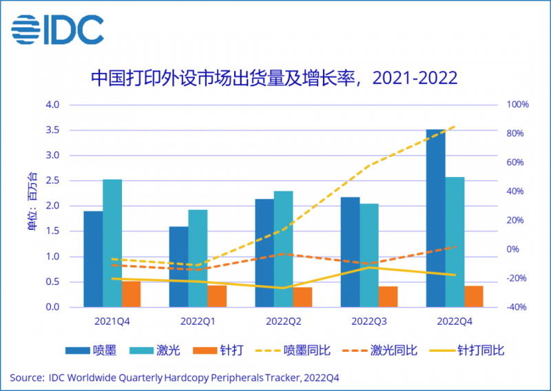 2月25日消息,IDC最新發(fā)布的《中國打印外設(shè)市場季度跟蹤報告(2022年第四季度)》顯示,2022年第四季度,中國打印外設(shè)市場出貨量為651.1萬臺,同比增長31.7%。