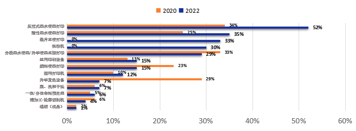 在所有回復(fù)選項中,236名受訪者中有52%使用活性墨水噴墨打印設(shè)備,36%采用裁片直噴,33%使用酸性墨水噴墨設(shè)備。此外,調(diào)查受訪者還被問及是否計劃購買任何紡織品印花或相關(guān)設(shè)備。如圖4所示,在2022年收到此問題的427名受訪者中,52%表示他們計劃購買反應(yīng)墨水噴墨打印機,35%表示他們計劃購買酸性噴墨打印機,33%表示他們計劃購買裁片直噴打印機。與2020年相比,計劃采購的技術(shù)存在一些顯著差異,盡管當(dāng)時只有122名受訪者回答了這個問題。然而,值得注意的是反應(yīng)墨水噴墨打印 (同比+18%) 和酸性墨水噴墨打印 (同比+10%) 的顯著增長。不幸的是,升華噴墨設(shè)備下降了22%,分散墨水噴墨設(shè)備下降了4%。