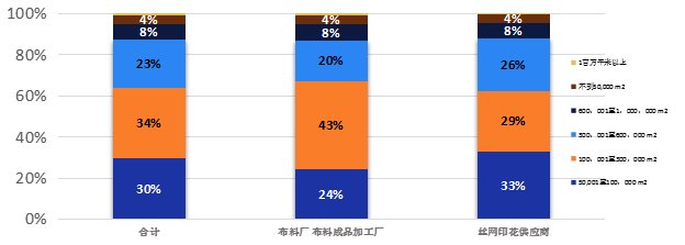 我們詢問受訪者每月在數(shù)碼設(shè)備上的印量 (平方米)。圖表顯示了每月印刷量,還是按照業(yè)務(wù)屬性劃分。首先,布料廠紡織廠的43%受訪者平均每月產(chǎn)量在100,000-299,000平方米為最常見的印量,其次是24%的受訪者表示他們每月的印量不超過999,999平方米 ,剩下的33%分布在各個印量區(qū)域,大部分的布料廠紡織廠在做大批量生產(chǎn)。用絲網(wǎng)設(shè)備的印花供應(yīng)商的回答幾乎可以平均分成三大塊,33% 表示他們的月平均印量在低于99,999平方米 ,29%表示他們的平均月印量在 100,000至299,999平方米之間,26%表示他們平均每月生產(chǎn)300,000到 999,999m 2之間。有趣的是如果我們把兩個屬性分類的平均印量做比較的話,他們的平均值之間只有685平方米的差異。