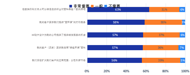 除了設(shè)備,印量等問題我們還請受訪者選擇了他們對自己公司的看法,我們的問題是請他們考慮一組陳述并將對其業(yè)務(wù)的重要性等級分為非常重要、中性或不重要。在212名和布料廠或布料加工有關(guān)的受訪者中,基本上過半的受訪者認(rèn)為每項陳述被評為非常重要,勾選非常重要的回答平均占全體的58%。
