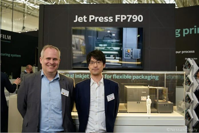 從左起,富士膠片包裝業(yè)務(wù)EMEA負責人Manuel Schrutt和富士膠片數(shù)字打印系統(tǒng)經(jīng)理Akashi Arai合影Nessan Cleary