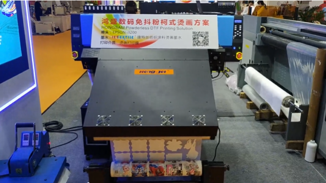整個展館各個設(shè)備廠家都在展示抖粉方案,鴻盛數(shù)碼則推出革命性的棉織物和多種介質(zhì)DTF免抖粉燙印方案,其工藝極大程度解決了抖粉膜轉(zhuǎn)印存在手感和透氣性等問題,成為數(shù)碼印花領(lǐng)域很好的一種補充方案,為繁榮數(shù)碼印花產(chǎn)業(yè),增添了一種更接地氣的解決途徑。該方案打印流程更短,全部流程只有三個步驟:打印——烘干——燙印。這類似于熱升華燙印滌綸,只不過采用了塑料膜代替了熱轉(zhuǎn)印紙,無“抖粉”環(huán)節(jié),減少了疵品的發(fā)生幾率,并回避了不少抖粉方案存在的問題。