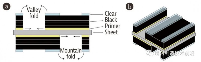 隨著3D打印技術(shù)的發(fā)展,具有可控性能的智能結(jié)構(gòu)4D打印正在獲得大量研究,折紙鑲嵌,有望為產(chǎn)品開(kāi)辟新的設(shè)計(jì)和應(yīng)用。當(dāng)前最流行的4D打印方法之一是通過(guò)加熱故意使從FDM 3D打印機(jī)擠出的熱塑性塑料發(fā)生變化,以實(shí)現(xiàn)運(yùn)動(dòng)或存儲(chǔ)。這種方法的優(yōu)點(diǎn)在于工藝容易獲得且成本較低,但分辨率不可避免的受到FDM 3D打印機(jī)的限制。另一種流行的4D打印方法是打印對(duì)濕度變化或(脫)水化反應(yīng)的可收縮自折疊材料,這種方法對(duì)需要生物安全性能的可穿戴設(shè)備和食品特別有用。然而,對(duì)于復(fù)雜的形狀變化,分辨率仍然是無(wú)法回避的問(wèn)題??傊?,當(dāng)前的4D打印技術(shù),要么分辨率低,要么需要手工,容易出錯(cuò)且后處理較為耗時(shí)。