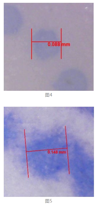 當(dāng)墨滴打印到表面光滑、密度較高的介質(zhì)上,比如車貼,墨滴擴(kuò)散范圍較?。ㄈ鐖D4);而如果打印表面較粗糙的介質(zhì)上,比如紙張,墨滴擴(kuò)散范圍較大(如圖5)。
