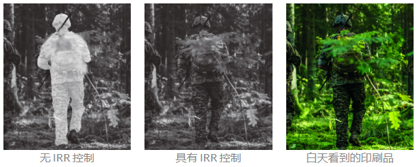 要滿足軍用迷彩印花對(duì)最終產(chǎn)品的諸多要求,需要使用到各種紡織品技術(shù)。迷彩印花最初用于軍事應(yīng)用,以隱藏或偽裝周圍的士兵、車輛或設(shè)備。這些圖案的靈感主要來(lái)自自然環(huán)境,如林地、沙漠、雪地或城市環(huán)境。而軍用迷彩印花有一個(gè)特殊功能是 IRR(紅外反射) 控制,不僅需要在白天確保偽裝效果,而且在黃昏和夜晚使用夜視設(shè)備時(shí)也需要確保偽裝效果,這是普通迷彩印花所不具備的特點(diǎn)。