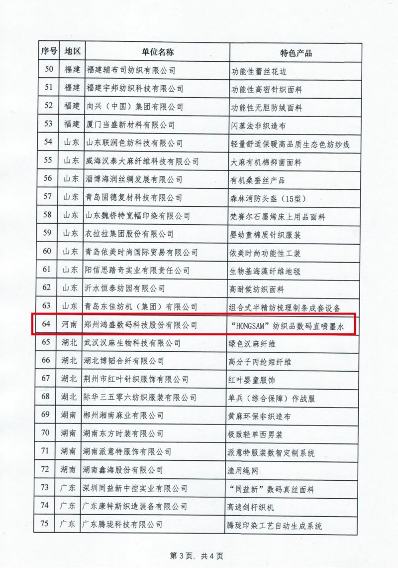 為貫徹落實習(xí)近平總書記關(guān)于“培育一批‘專精特新’中小企業(yè)”、提升中小企業(yè)創(chuàng)新能力的重要指示精神,貫徹落實黨的二十大精神,中國紡織工業(yè)聯(lián)合會繼續(xù)開展了紡織行業(yè)專精特新企業(yè)培育入庫工作。2023年上半年開始,經(jīng)過企業(yè)申報和協(xié)會推薦、實地考察、審核等程序,確定了紡織行業(yè)專精特新企業(yè)(第四批)和第一批專精特新企業(yè)復(fù)核通過名單,本次第四批新認(rèn)定“專精特新”企業(yè),全國共81家,鴻盛數(shù)碼是其中之一,也是河南省唯一的一家。