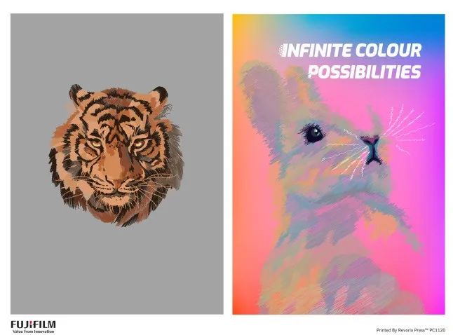會(huì)上,富士膠片商業(yè)創(chuàng)新(中國(guó))有限公司色彩中心經(jīng)理朱蕓青圍繞主題“數(shù)碼專色的新世界”介紹了如何利用Revoria Press™ PC1120獨(dú)有的金、銀、白、透明色、霓虹粉或中國(guó)紅中任意兩色搭配CMYK,實(shí)現(xiàn)白墨打底、各種金屬色、局部UV等豐富的專色工藝。