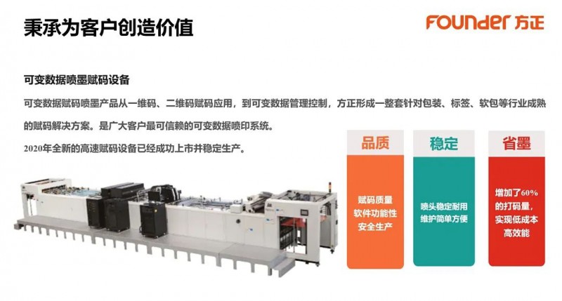 近年來(lái),方正電子在按需印刷、智能包裝等領(lǐng)域重點(diǎn)耕耘,在噴墨印刷、數(shù)字印刷、自主軟件三大方向的系列產(chǎn)品持續(xù)發(fā)力,以貼近市場(chǎng)的技術(shù)變革和創(chuàng)新,與行業(yè)共創(chuàng)印刷新價(jià)值。