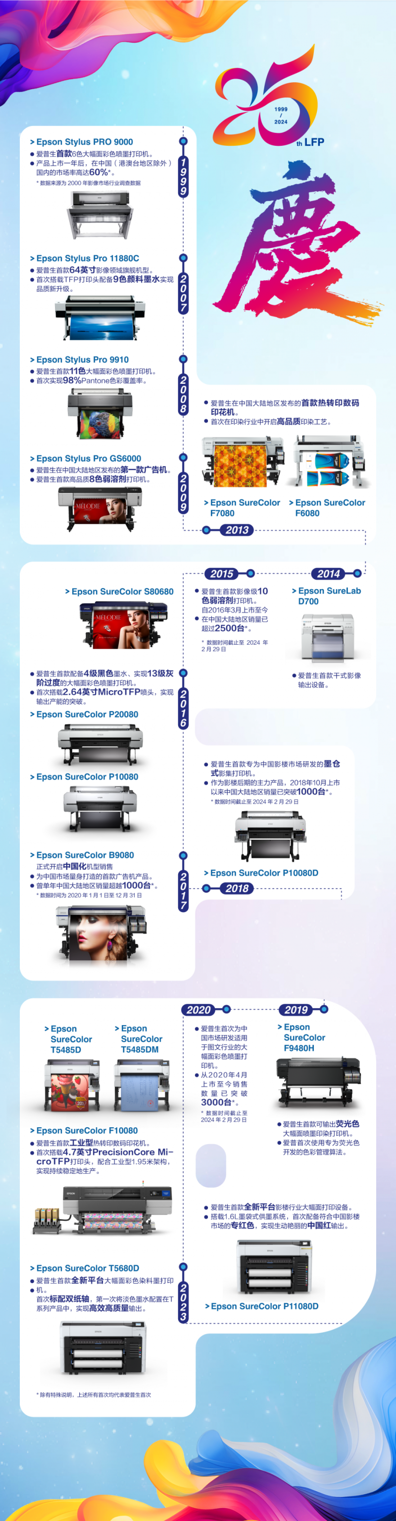 今年是愛普生大幅面業(yè)務進入中國的第25年。自1999年,愛普生大幅面首款6色彩色噴墨打印機Epson Stylus PRO 9000面世后,就收獲中國市場高度認可,發(fā)展至今已有113款愛普生大幅面產(chǎn)品,其中有10多款在中國市場首發(fā),譜寫了愛普生大幅面業(yè)務在中國發(fā)展的眾多第一。依托技術(shù)優(yōu)勢,愛普生大幅面在眾多行業(yè)深耕拓寬,目前已覆蓋了高端影像、廣告、印染、影樓、圖文等多個領域。