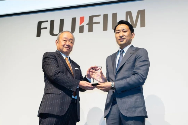 富士膠片控股株式會社代表取締役社長兼CEO后藤禎一(左)向富士膠片(中國)印藝傳播事業(yè)部總經(jīng)理大木雄次(右)授予表彰獎杯