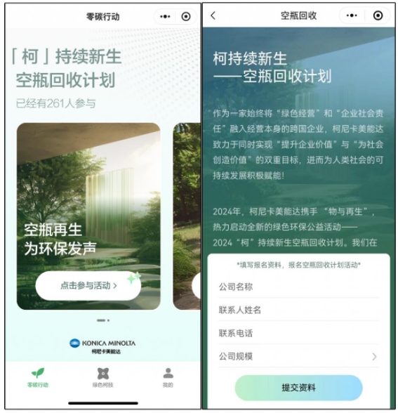 在新上線的小程序中,柯尼卡美能達(dá)中國設(shè)立了「零碳行動(dòng)」專區(qū),提供了創(chuàng)新的線上互動(dòng)平臺(tái),邀請(qǐng)各界伙伴共同踏上綠色零碳之旅。近期,柯尼卡美能達(dá)中國與環(huán)保服務(wù)商物與再生合作,啟動(dòng)了“‘柯’持續(xù)新生空瓶回收計(jì)劃”。在上海總部、北京、廣州、深圳分公司及部分經(jīng)銷商伙伴的辦公室成功設(shè)立實(shí)體回收站點(diǎn)后,該活動(dòng)現(xiàn)已正式登陸「零碳行動(dòng)」專區(qū)??履峥滥苓_(dá)中國希望通過這一計(jì)劃,廣泛號(hào)召更多合作伙伴和企業(yè)參與“撿塑”行列,收集廢棄空瓶,實(shí)現(xiàn)資源的循環(huán)再利用,構(gòu)建綠色、可循環(huán)的生態(tài)體系。