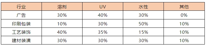 除了UV墨水在新興行業(yè)的應(yīng)用,當(dāng)前各類型的數(shù)碼噴印墨水的應(yīng)用比例預(yù)估如下: