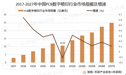 中國(guó)PCB數(shù)字噴印行業(yè)市場(chǎng)規(guī)模從2017年的2.97億美元增長(zhǎng)至2022年的10.65億美元,年復(fù)合增長(zhǎng)率達(dá)29.10%。隨著技術(shù)迭代及應(yīng)用滲透率的推動(dòng)下,中國(guó)PCB數(shù)字噴印行業(yè)未來5年將以17.83%的年復(fù)合增長(zhǎng)率增長(zhǎng)。