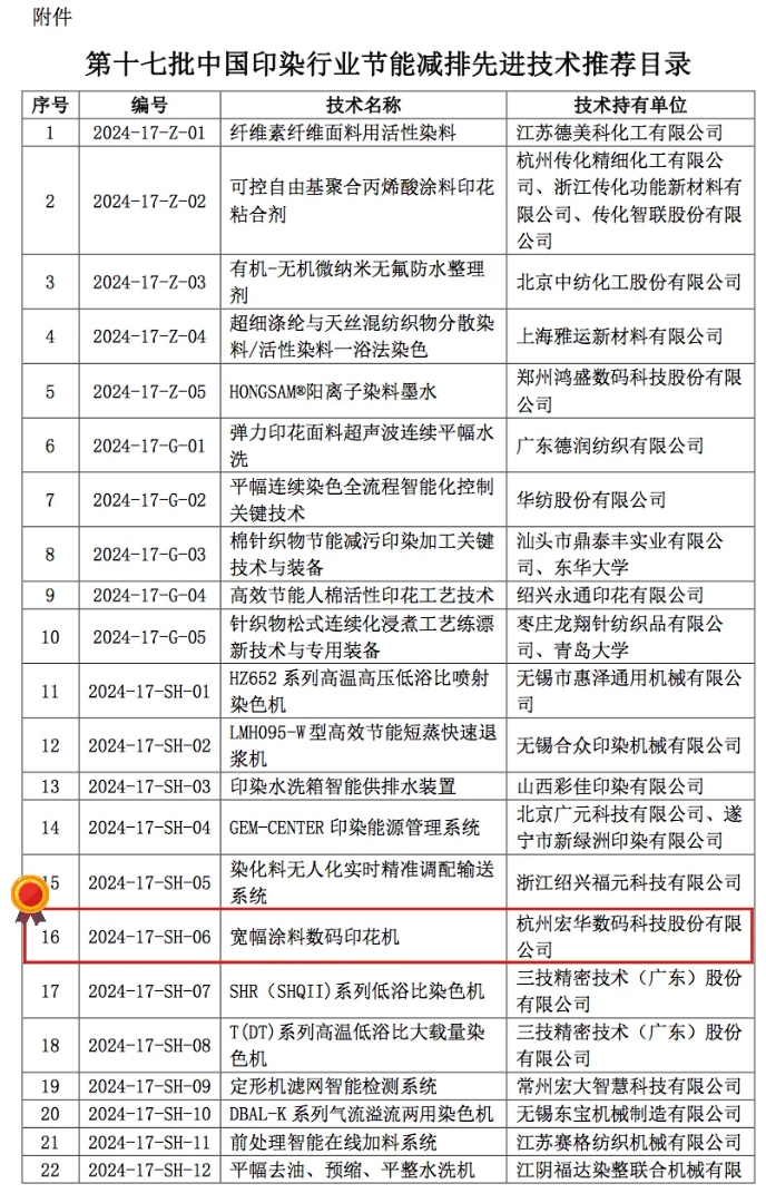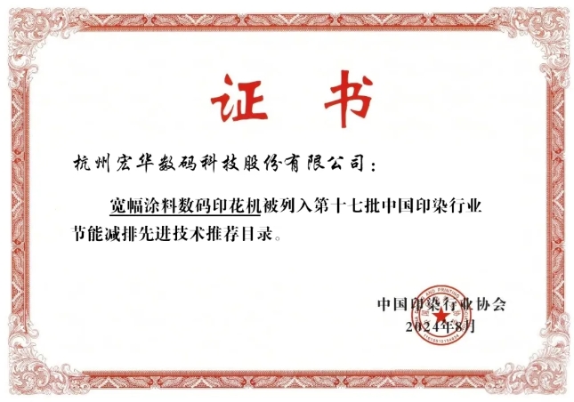在“遠信·2024全國印染行業(yè)節(jié)能環(huán)保年會”上,杭州宏華數(shù)碼科技股份有限公司(以下簡稱“宏華數(shù)科”)的寬幅涂料數(shù)碼印花機榮幸被列入《中國印染行業(yè)節(jié)能減排先進技術(shù)推薦目錄》。這一榮譽不僅是對宏華數(shù)科技術(shù)創(chuàng)新和環(huán)保貢獻的認可,也是對宏華數(shù)科在推動印染行業(yè)綠色發(fā)展方面所做努力的肯定。