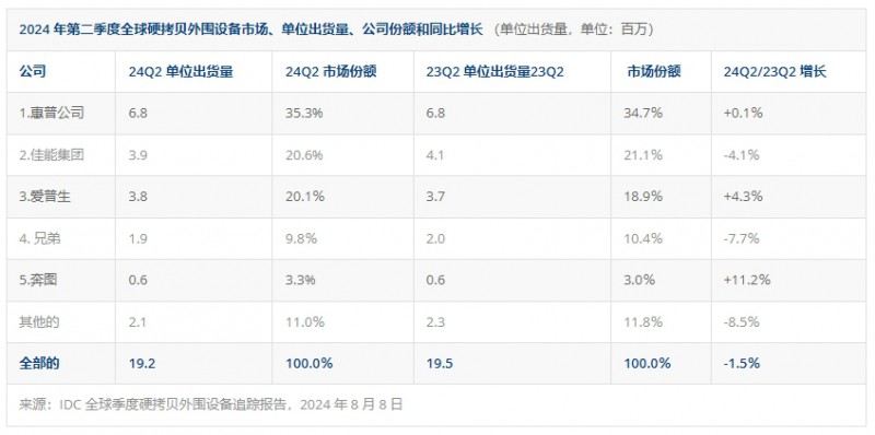 根據(jù)IDC全球季度硬拷貝外圍設(shè)備追蹤報告,第二季度全球打印設(shè)備(HCP)出貨量與去年同期相比下降了1.5%。