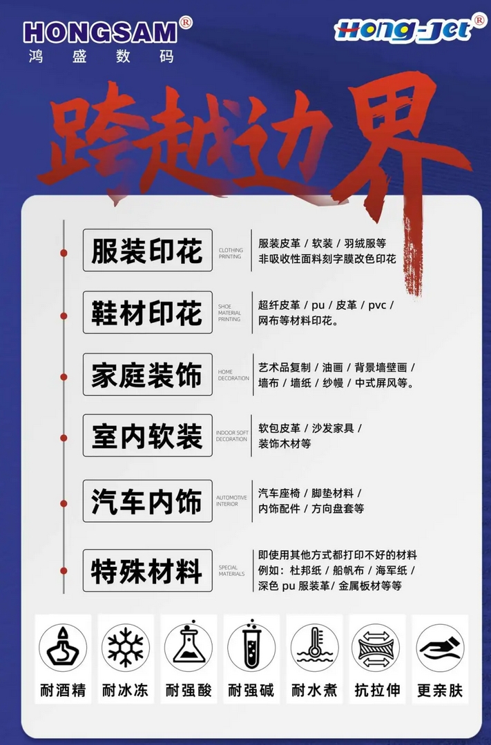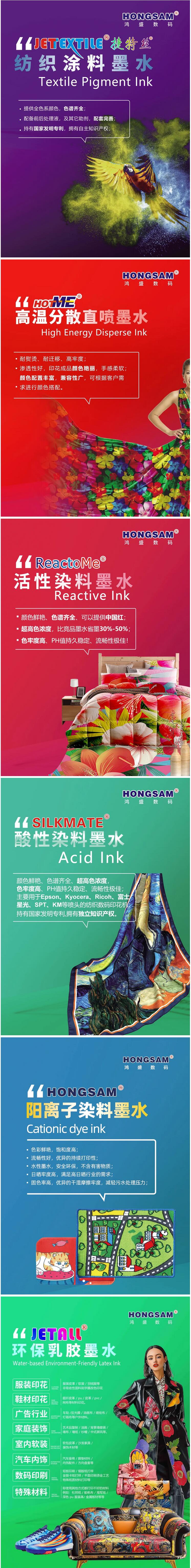 鴻盛數(shù)碼(展位號:H5-A09)將攜旗下全系列紡織噴墨墨水(捷特絲®紡織涂料墨水、鴻美®分散染料墨水、銳美®活性染料墨水、絲美特®酸性染料墨水、HONGSAM®陽離子染料墨水)、HJ-1808L乳膠打印機、以及水性環(huán)保乳膠打印方案、鴻捷全數(shù)碼柯式燙畫解決方案等多款主力產(chǎn)品重磅出席此次展會。