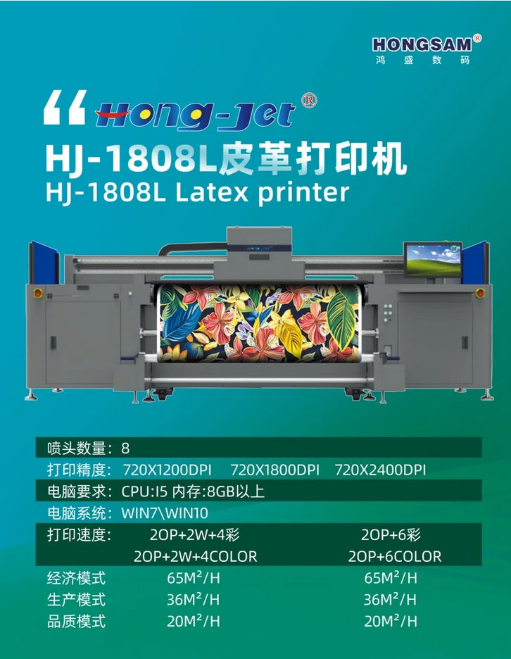 鴻捷HJ-1808L 乳膠打印機,高速水性環(huán)保打印設(shè)備,可實現(xiàn)無涂層介質(zhì)水性數(shù)字印刷,每小時實現(xiàn)60㎡高速輸出。水性乳膠印花工藝可達到綠色環(huán)保,無異味,無VOCs排放,有效提升產(chǎn)品環(huán)保品質(zhì);材料適應(yīng)性更加廣泛,乳膠墨水不僅可覆蓋大部分現(xiàn)有的噴墨應(yīng)用,甚至拓展和延伸了之前噴墨所不能的領(lǐng)域;各種材質(zhì)高牢度輸出,圖案耐拉伸,完美解決了UV打印圖案拉伸開裂等長久頑疾。