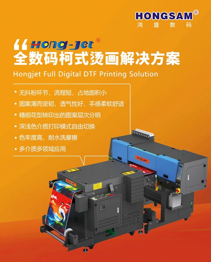 鴻捷全數(shù)碼柯氏燙畫解決方案適用于棉織物和多種介質(zhì),無需抖粉環(huán)節(jié),其工藝極大程度解決了抖粉膜轉(zhuǎn)印存在手感和透氣性等問題,成為數(shù)碼印花領(lǐng)域很好的一種補充方案,為繁榮數(shù)碼印花產(chǎn)業(yè),增添了一種更接地氣的解決途徑。該方案打印流程更短,全部流程只有三個步驟:打印——烘干——燙印。此方案無“抖粉”環(huán)節(jié),減少了疵品的發(fā)生機率,并回避了不少抖粉方案存在的問題。