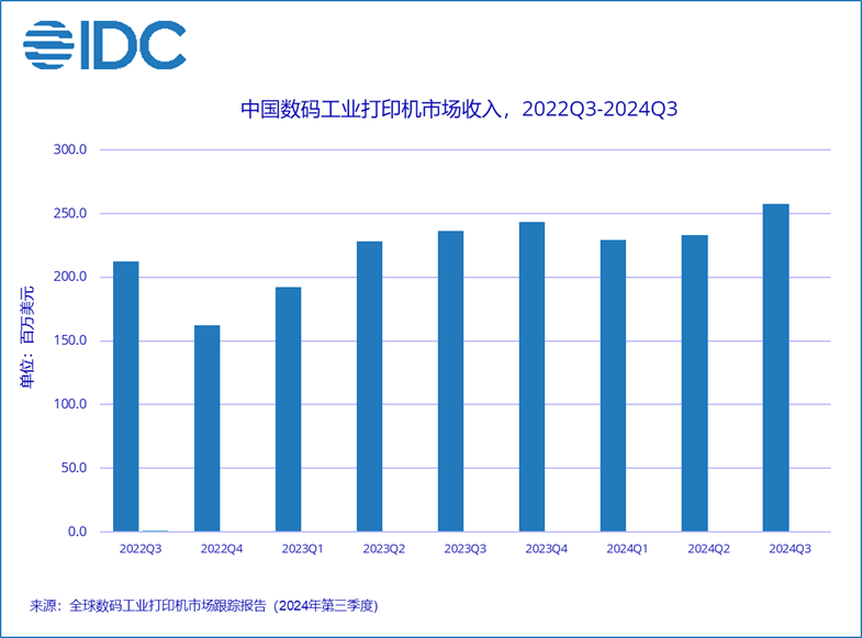 2024年11月27日國際數(shù)據(jù)公司(IDC)于近日發(fā)布了《全球工業(yè)打印機市場跟蹤報告(2024年第三季度)》。IDC數(shù)據(jù)顯示,2024年第三季度,中國國內(nèi)數(shù)碼工業(yè)打印機整體市場規(guī)模收入突破2.6億美金,同比上升8.8%。其中大幅面數(shù)碼印刷機市場收入同比下滑5.0%, 數(shù)碼紡織印花機同比上升20.0%,數(shù)碼工業(yè)包裝和標簽印刷機則同比上升17.0%。