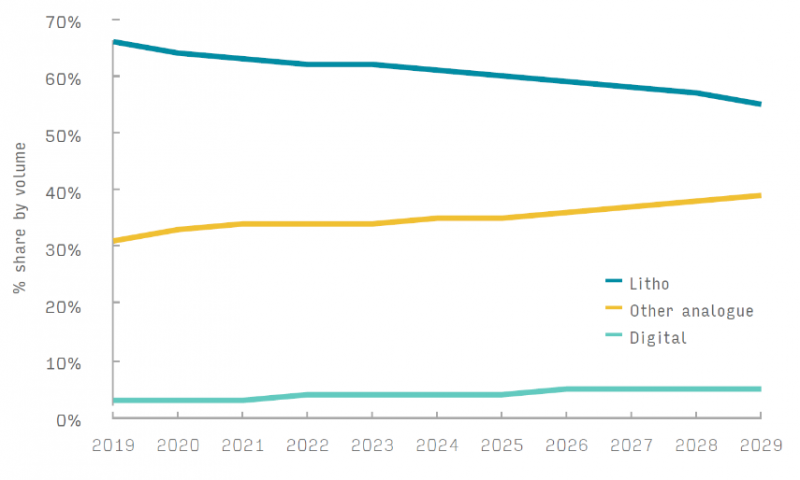 史密瑟斯的數(shù)字化轉(zhuǎn)型預(yù)測(cè)顯示,盡管膠印在印刷頁數(shù)方面呈現(xiàn)下降趨勢(shì),但仍占據(jù)市場(chǎng)主導(dǎo)地位。柔印和凹印在包裝領(lǐng)域的頁數(shù)當(dāng)量正在增加,而數(shù)字印刷雖然目前僅占全球印刷產(chǎn)量的10%以下,但其市場(chǎng)價(jià)值卻不容小覷。預(yù)計(jì)到2029年,數(shù)字印刷的支出將超過膠印。