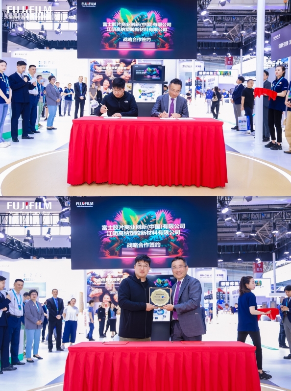江陰高納塑膠新材料有限公司總經(jīng)理馮琦(左)、富士膠片商業(yè)創(chuàng)新(中國)董事長兼總裁中村達(dá)也(右)