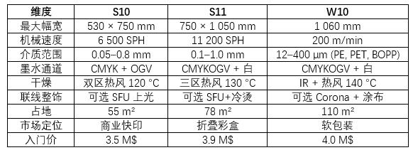 S11 作為 B1 幅面單張紙印刷機(jī),在速度方面表現(xiàn)卓越,可達(dá) 11,200 張 / 小時(shí)。其幅面優(yōu)勢(shì)使其在折疊彩盒生產(chǎn)領(lǐng)域具有得天獨(dú)厚的條件,能夠高效地處理大型紙盒的印刷需求。在介質(zhì)方面,S11 具備廣泛的適應(yīng)性,可以在各種常見(jiàn)的紙張和紙板上進(jìn)行高質(zhì)量印刷,無(wú)論是涂層紙還是非涂層紙,都能輕松應(yīng)對(duì)。從坐標(biāo)圖上看,S11 位于速度較高、幅面較大且介質(zhì)適應(yīng)性廣泛的區(qū)域,精準(zhǔn)地定位于折疊彩盒這一細(xì)分市場(chǎng)。