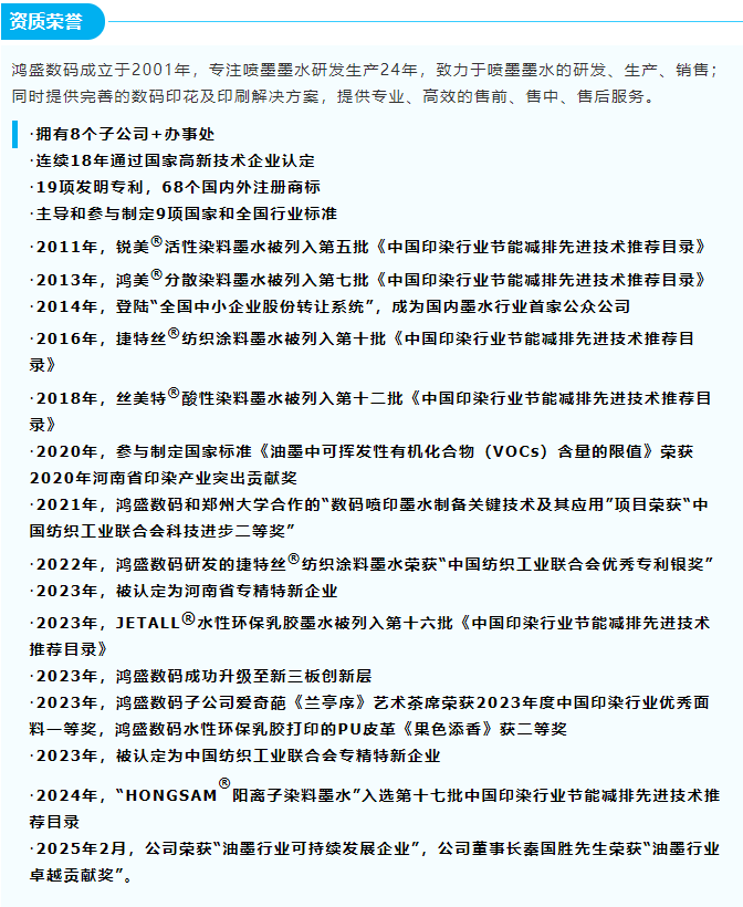 當(dāng)然,水性環(huán)保、綠色安全是我們優(yōu)勢的基石。乳膠油墨采用純水基配方、不含有機(jī)溶劑,鴻盛數(shù)碼作為《油墨中可揮發(fā)有機(jī)化合物VOCs含量的限值》國家標(biāo)準(zhǔn)的定制單位,從墨水源頭保證企業(yè)綠色環(huán)保生產(chǎn);水性環(huán)保墨水并且獲得OEKO-TEX® ECO PASSPORT認(rèn)證,歐盟訂單直通。