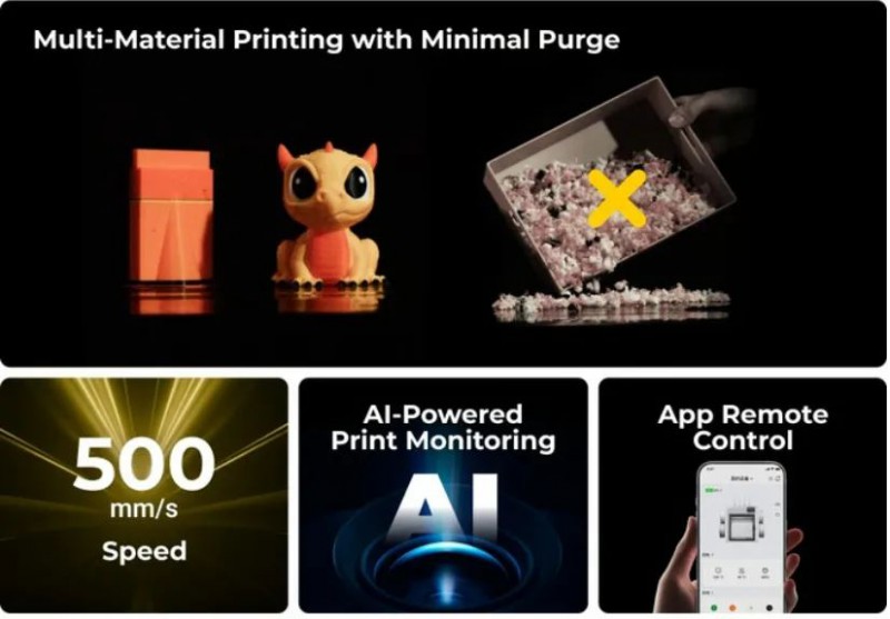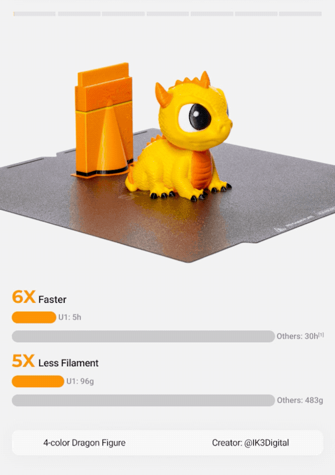 這款打印機(jī) “更專注于速度、效率和色彩鮮艷度”,功能十分強(qiáng)大。為了實(shí)現(xiàn)高速運(yùn)行,Snapmaker U1 搭載了 CoreXY 系統(tǒng)。借助這一系統(tǒng),其最高打印速度可飆升至 300 毫米 / 秒,加速度高達(dá) 20000 毫米 / 秒 ²,最大行進(jìn)速度也能達(dá)到 500 毫米 / 秒。同時(shí),為了減少材料浪費(fèi),Snapmaker U1 搭載 SnapSwap™四頭自動(dòng)換刀系統(tǒng),支持 5 秒內(nèi)快速切換顏色或材料,顯著減少清洗塔與沖洗工序引發(fā)的材料損耗和浪費(fèi)。最終,Snapmaker U1 不僅實(shí)現(xiàn)了多色打印速度提升 5 倍,還將耗材浪費(fèi)大幅削減了 80%。