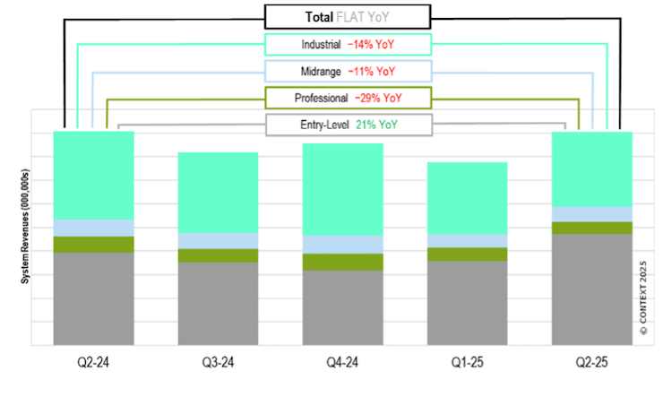 該公司最新的增材制造市場洞察報告顯示,2025年第二季度入門級市場(低于2,500美元)的收入增長了21%,但專業(yè)級(2,500-20,000美元)、中端級(20,000-100,000美元)和工業(yè)級(100,000美元以上)機器的收入分別下降了29%、11%和14%。這些發(fā)現(xiàn)與 CONTEXT今年夏季發(fā)布的2025年第一季度報告的結(jié)果相似。