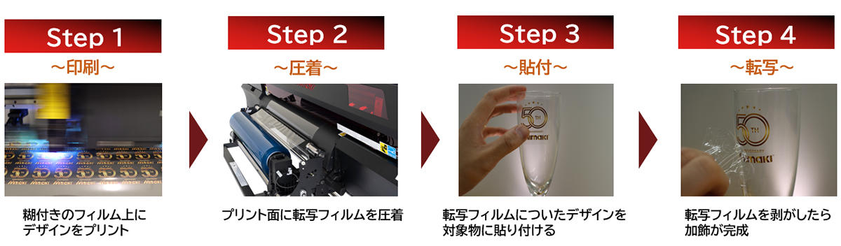 UV-DTF專用膜由帶膠膜與轉(zhuǎn)印膜兩層組成,加飾流程如【圖1】所示。由于只有圖案部分會被轉(zhuǎn)印到目標物上,因此無需像貼紙那樣進行去除多余邊角的“除廢”作業(yè)。同時,因為并非直接在素材上打印,也能有效避免因位置偏差導致的打印錯誤,使得在高價值商品上進行加飾更加安全可靠,顯著拓寬了定制商品制作的可能性。