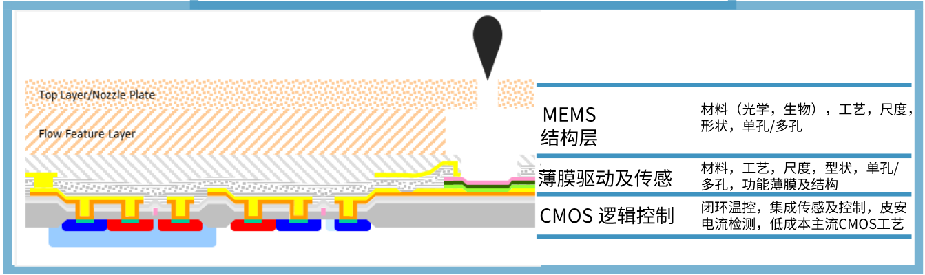 在噴墨打印頭領(lǐng)域,典型結(jié)構(gòu)包括熱發(fā)泡驅(qū)動(dòng)、微流道結(jié)構(gòu)、薄膜驅(qū)動(dòng)膜、閉環(huán)溫度控制、液滴噴射控制等。