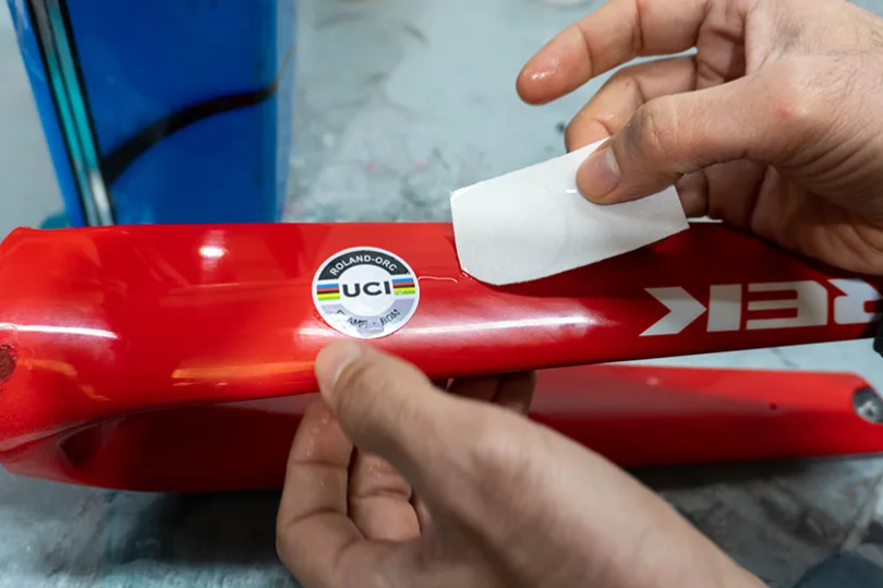 然后你把貼花從紙上轉(zhuǎn)移下來(lái),貼在自行車(chē)架上。水性貼紙非常薄,是裝飾弧形表面的理想材料