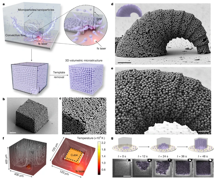 第三步,飛秒激光誘導(dǎo)可控微流。研究者在模板開口附近,用直徑約2微米的飛秒激光進(jìn)行精準(zhǔn)照射,激光局部加熱會(huì)形成陡峭的溫度梯度,進(jìn)而引發(fā)強(qiáng)烈的對(duì)流和定向流動(dòng),這種由光誘導(dǎo)產(chǎn)生的“光流”如同無形的手,將溶液中的功能顆粒持續(xù)、精準(zhǔn)地“推送”進(jìn)空心模板內(nèi)部,實(shí)現(xiàn)顆粒的定向運(yùn)輸與初步排列。
