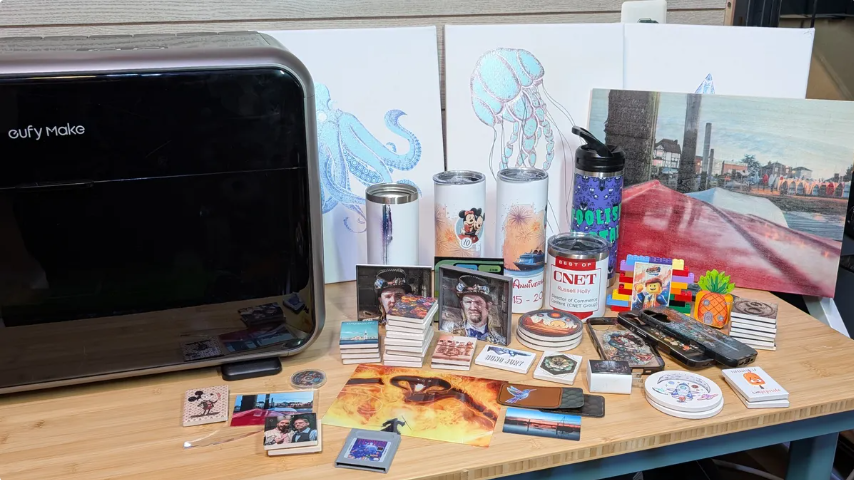 在便捷性與實(shí)用性上,eufyMake E1同樣做足了優(yōu)化。它采用3合1模塊化設(shè)計(jì),體積較傳統(tǒng)UV打印機(jī)縮小約90%,機(jī)身尺寸僅為590*250*407mm、重量約20公斤,相當(dāng)于一臺(tái)微波爐大小,適配家庭工作室、桌面等空間有限的場(chǎng)景,真正實(shí)現(xiàn)“桌面級(jí)專(zhuān)業(yè)打印”。設(shè)備支持平面打印、圓柱體打印、UV轉(zhuǎn)印貼三種工作模式,其中平面打印工作范圍達(dá)300*300mm,搭配可選旋轉(zhuǎn)配件,可輕松實(shí)現(xiàn)馬克杯、花瓶等圓形物體的個(gè)性化定制,而UV轉(zhuǎn)印貼功能則進(jìn)一步拓展了創(chuàng)作場(chǎng)景,讓用戶可制作可撕貼標(biāo)簽等多樣作品。此外,設(shè)備內(nèi)置JetClean自動(dòng)維護(hù)系統(tǒng),可定期清潔噴頭,降低堵塞風(fēng)險(xiǎn),減少手動(dòng)維護(hù)工作量;配備800萬(wàn)像素?cái)z像頭和自動(dòng)調(diào)平系統(tǒng),輔助打印前的定位操作,即便新手也能輕松上手。