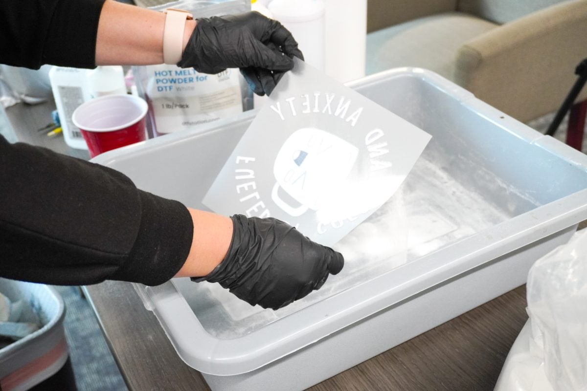 接下來(lái),將粘合劑粉末均勻地撒在濕潤(rùn)的油墨上。撒粉均勻并去除多余粉末后,將薄膜加熱,準(zhǔn)備進(jìn)行織物轉(zhuǎn)印。粘合劑的加熱可在固化爐或熱壓機(jī)中進(jìn)行。