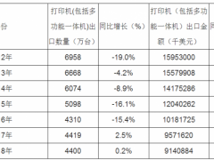 根據(jù)中國(guó)海關(guān)數(shù)據(jù)顯示:2018年1-12月中國(guó)打印機(jī)(包括多功能一體機(jī))出口數(shù)量為4400萬(wàn)臺(tái),同比增長(zhǎng)0.2%;2018年1-12月中國(guó)打印機(jī)(包括多功能一體機(jī))出口金額為9140884千美... [詳細(xì)]