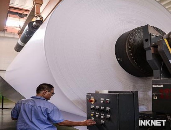 工人在數(shù)十噸重的銅版紙紙卷前操作設(shè)備