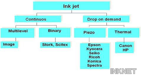 噴墨技術(shù)分為連續(xù)噴墨和按需噴墨(DOD)兩種,前者目前只用在柯達(dá)的數(shù)字印刷機(jī)上,市場(chǎng)上的絕大部分噴墨打印機(jī)都屬于按需噴墨技術(shù),按需噴墨又分為壓電和熱發(fā)泡兩類(lèi),熱發(fā)泡噴頭廉價(jià)、精度高,但其缺點(diǎn)也是顯而易見(jiàn)的:噴頭壽命短、只適用水性墨水,因之主要用于家庭和辦公室的紙張打??;而壓電噴墨是利用陶瓷加上電壓后會(huì)變形的原理,直接將電壓轉(zhuǎn)換為機(jī)械壓力,工作在常溫下,也無(wú)需溶解在水中的氧氣幫忙,所以不但噴頭壽命長(zhǎng),而且可以適用各種類(lèi)型溶劑所生產(chǎn)的墨水。