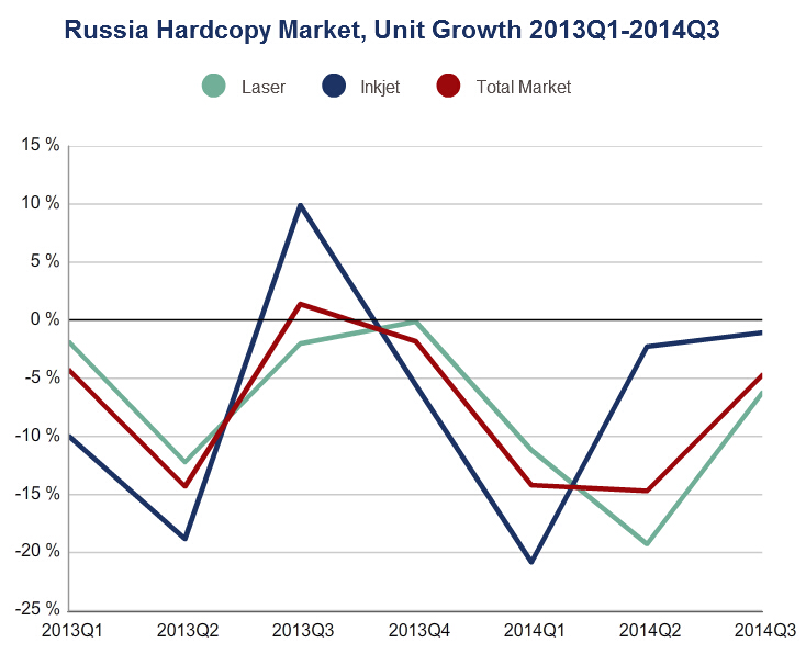 IDC數(shù)據(jù)顯示,俄羅斯第三季度激光和噴墨產(chǎn)品分別同比減少了6.23%和1.06%。其中,噴墨廠商的中心已經(jīng)從低利潤的入門級噴墨產(chǎn)品轉(zhuǎn)向高端噴墨產(chǎn)品。