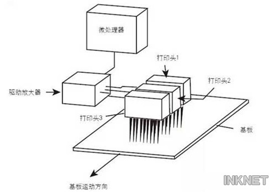 微處理器能進一步操控基板相對于每個打印頭的移動。這種運動可以是單方向進行或多方向進行。通常,基板按圖1箭頭指示的方向單方向運動,即從打印頭1照射的位置移動到打印頭2照射的位置,再移動到打印頭3照射的位置。除了基板可以運動之外,打印頭也可以運動。例如,打印頭的寬度比基板的寬度小時,打印頭可沿垂直于圖1中的箭頭方向移動。