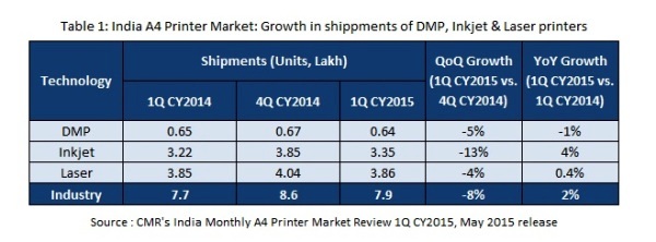 根據(jù)印度咨詢公司CyberMedia Research(CMR)近日發(fā)布的報告,今年第一季度印度A4打印機(包括噴墨、激光打印機以及DMP系統(tǒng))的出貨量對比2014年第三季度下降8%,與去年同期對比則增長了2%。