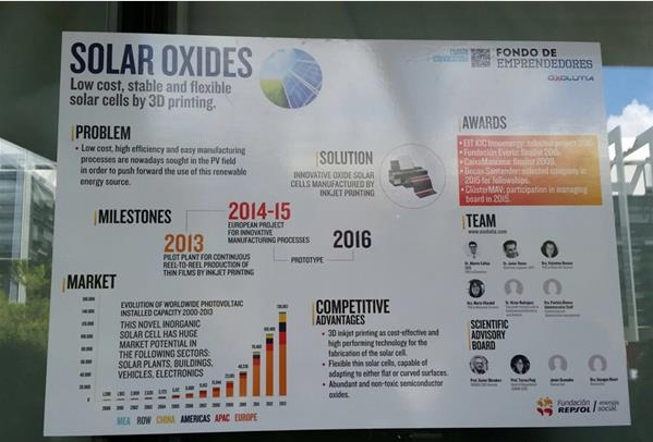 由于極具發(fā)展?jié)摿?,Solar Oxides已經(jīng)被選為了2015 Fundación 雷普索爾創(chuàng)業(yè)基金的9個獲勝項目之一。這些項目不但可以獲得一筆28.8萬歐元的資金,還將獲得一個輔導團隊的幫助,具體包括培訓、技術和法律顧問等,使它們的技術解決方案能夠盡快進入市場。