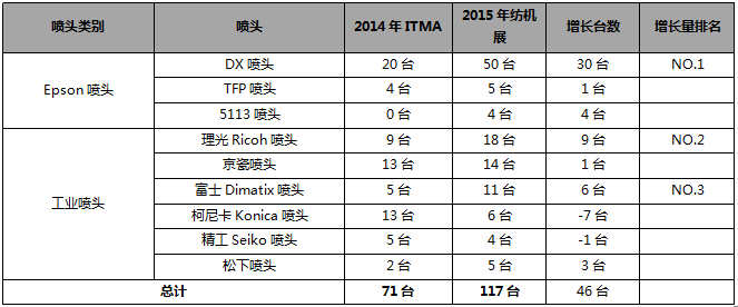 2015年紡機展參展印花設(shè)備數(shù)量總量,比2014年ITMA展增長46臺。