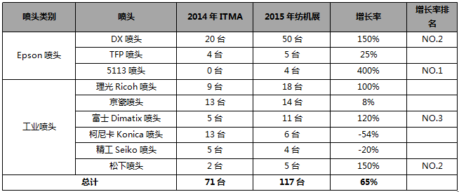 2015紡機展參展印花設(shè)備明顯增長,與2014年相比,今年增長率達到65%。
