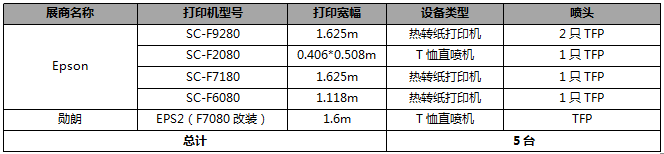 展商包括:Epson、勛朗。由于勛朗印花設(shè)備由Epson F7080改裝而成,因此,TFP噴頭僅為Epson自身所壟斷。