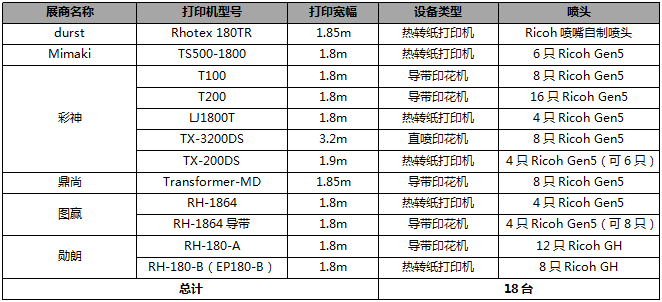 展會共統(tǒng)計18臺理光噴頭打印設(shè)備。除了durst(采用Ricoh噴嘴制作噴頭),勛朗(Ricoh GH小噴頭),其余展商全部使用Ricoh Gen5噴頭。