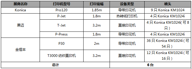 共統(tǒng)計Konica噴頭參展設(shè)備6臺,主要應(yīng)用Konica KM1024噴頭和KM1024i噴頭。