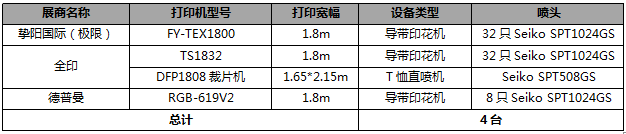 展會共統(tǒng)計京瓷噴頭印花機14臺,使用京瓷KJ4B噴頭(2656只噴嘴)。