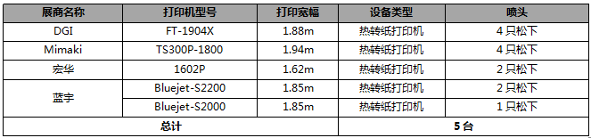 共統(tǒng)計松下噴頭印花設(shè)備5臺,比去年增加3臺,有明顯增長。