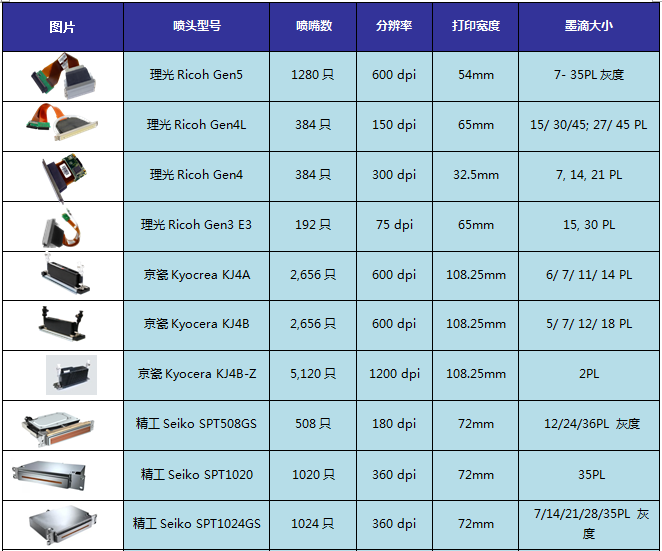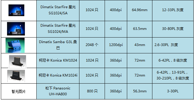 2015印花工業(yè)噴頭參數(shù)對比